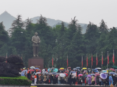 第二天,韶山下起了小雨, 然而寒風冷雨仍然難以阻擋來韶山游客的熱情,在毛澤東廣場,游客打著雨傘、披著雨衣給毛主席銅像敬獻花籃。毛澤東廣場位于韶山沖中心,距毛主席故居和紀念館都很近。