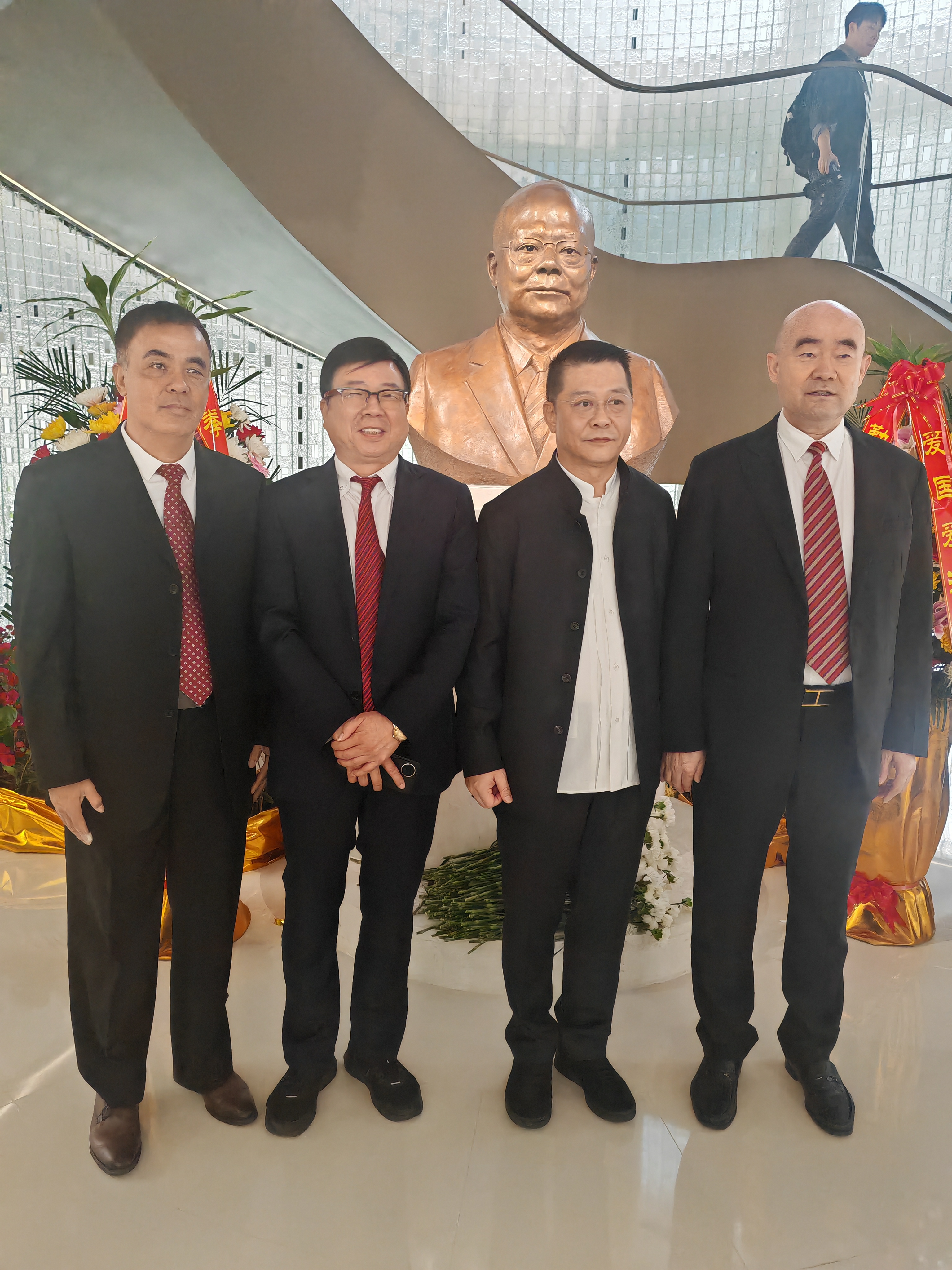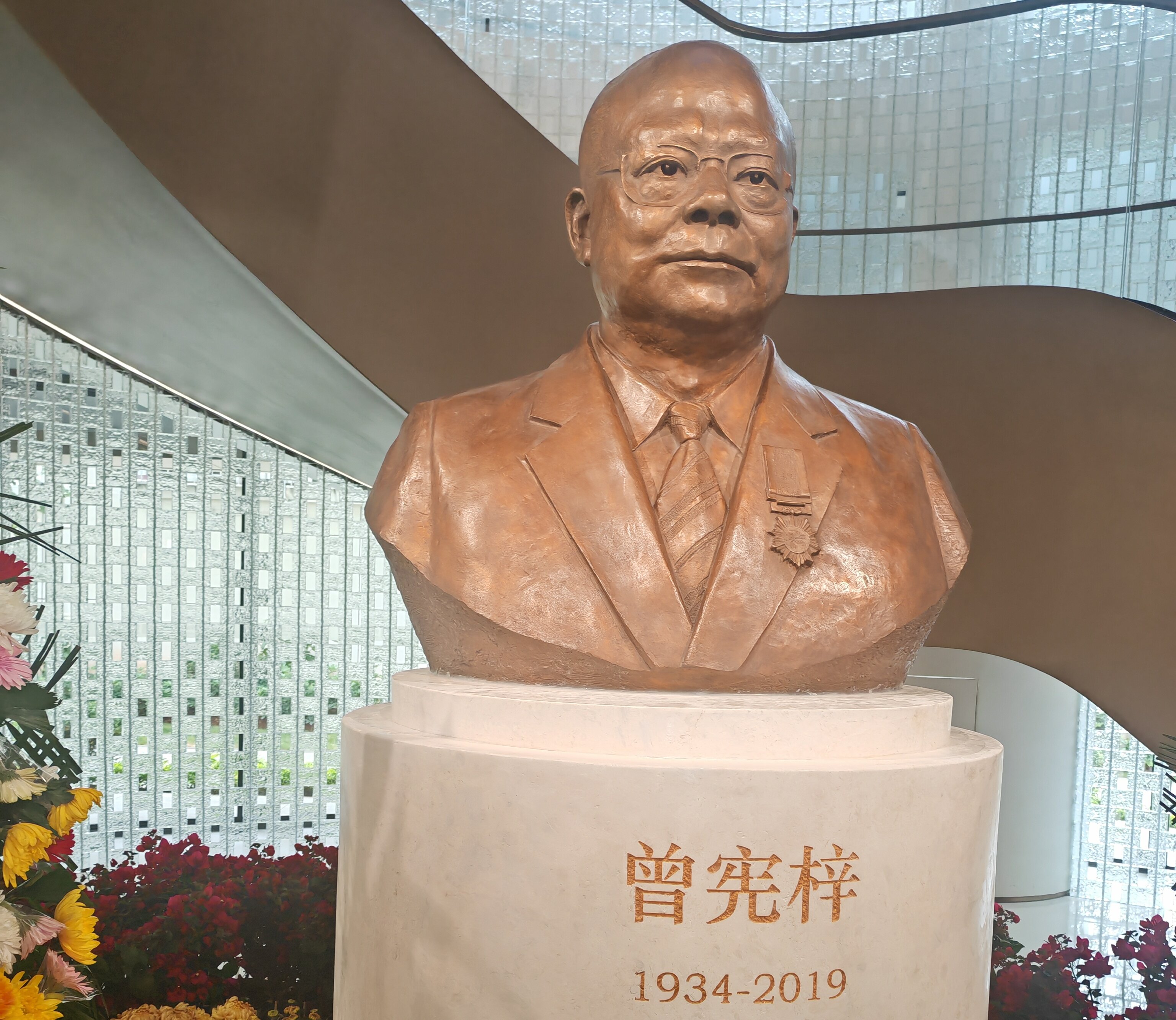 鮮花簇擁著雕像,仿佛在訴說著人們對曾憲梓先生的無盡敬意和思念。